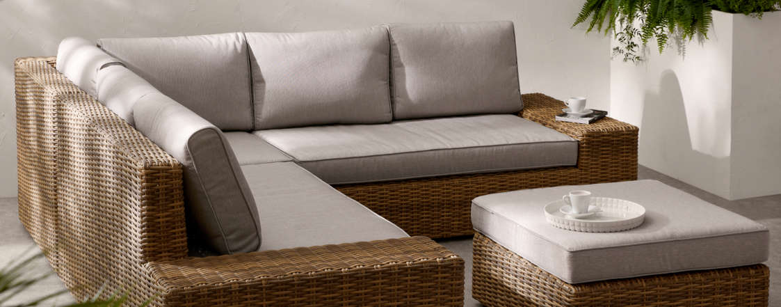 - Optez pour des canapés modulaires en rotin ou en aluminium recouverts de tissus d'extérieur résistants aux intempéries.